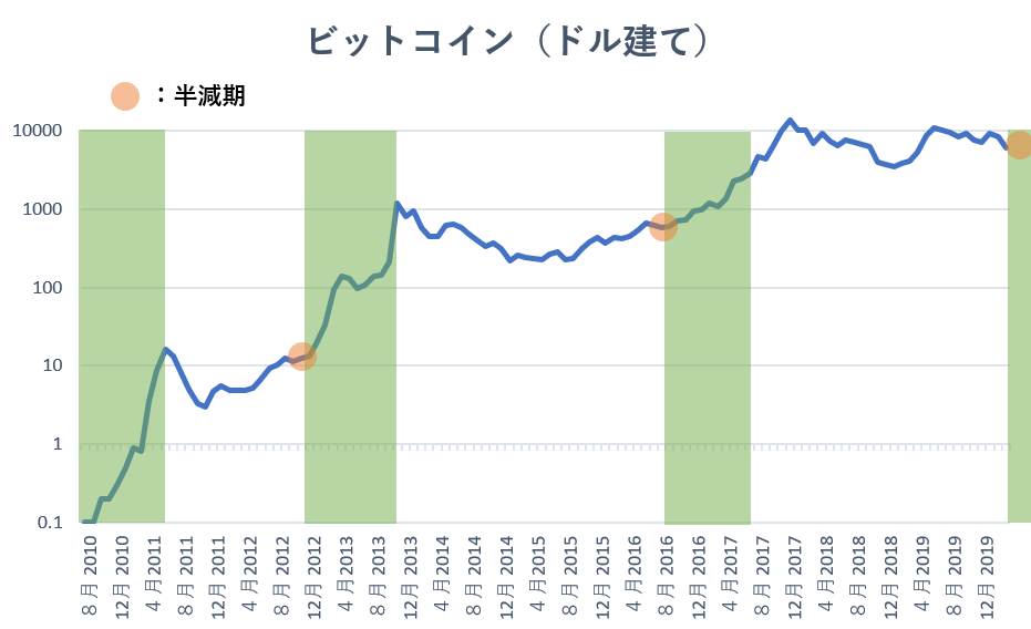 半減期を迎えると供給量が抑制されるので一時的に価格が高騰しやすくなります。事実、過去のビットコイン価格の推移を振り返ると、半減期の後にビットコイン価格が大暴騰していました。