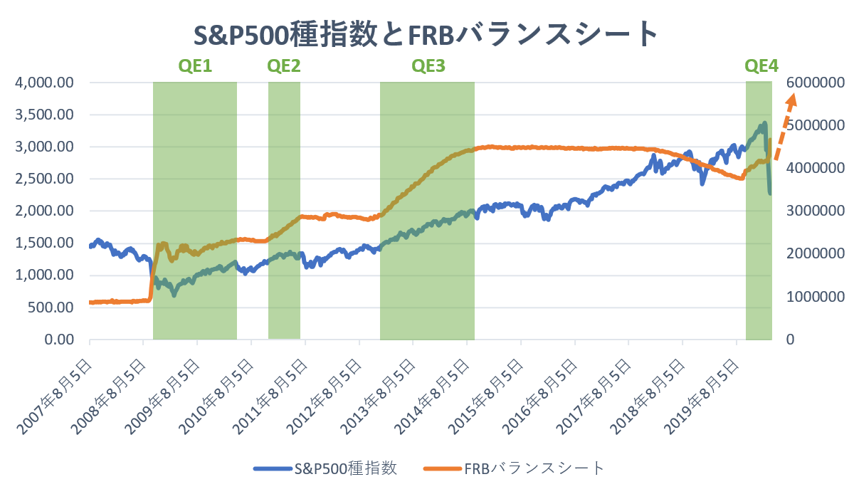 このように、FRBが企業と家計の資金供給を支えるために、無制限の米国債やMBSを買い入れれば、バランスシートは一段と拡大しますから、その分市場に大量の資金が供給されるので、株式市場も追い風となります。