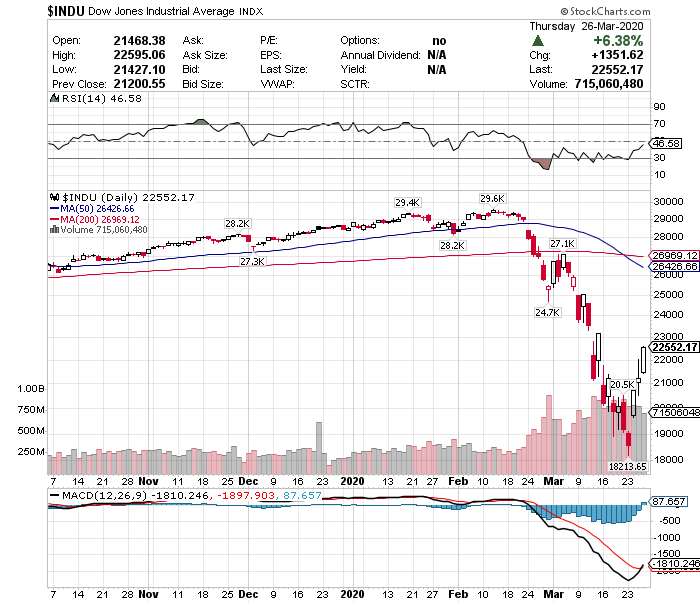 さて、ダウ平均は直近の安値1万8213ドルから23.8%高の2万2552ドルと大きく反発しています。定義上、直近の高値から-10%を調整入り、-20%を弱気相場入り、直近の安値から+20%を強気相場入りとしているので、ダウ平均は強気相場入りしたことを意味します。