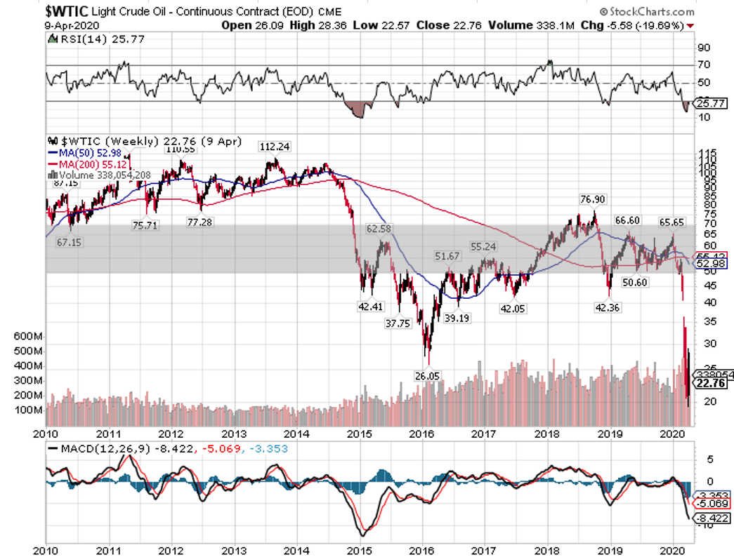 過去最大規模の減産を好感して、原油先物価格は前日比+5.80%高の24.08ドルと急騰しています。しかし、新型コロナウイルスのパンデミック(世界的大流行)を受けて、ヒトとモノの移動が制限されるなど原油需要が低迷していることを考えれば、減産効果は限定的と言えます。