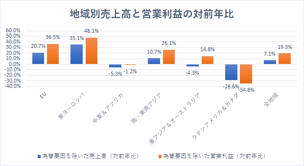 「東ヨーロッパ」の売上高は同35.1%増、営業利益は同48.1%増と好調でした。