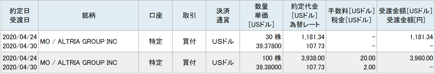 米タバコ最大手のアルトリア・グループ(MO)の株式を一株39.38ドルで130株、5119ドル(約55万円)分買い増しました。