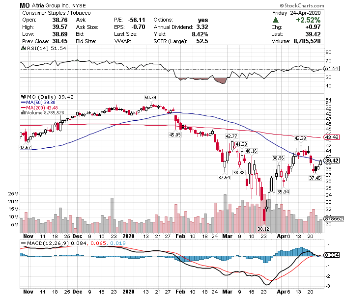 アルトリアの株価は一時30.12ドルを付ける場面がありましたが、現在30.9%高の39.42と大幅反発しています。
