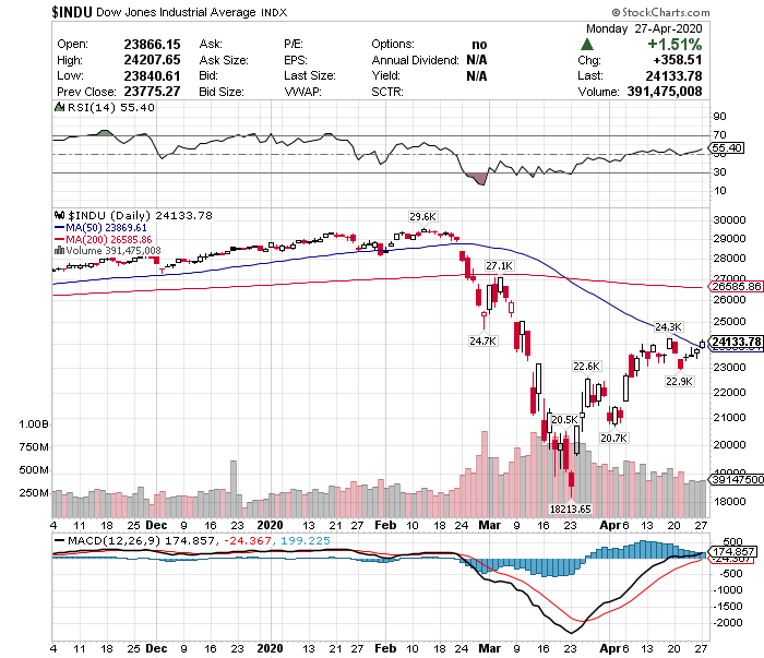 27日のNYダウ株式市場は前日比358.51ドル(1.51%)高の2万4133.78ドルと大きく上昇して取引を終えました。上昇した主な要因は、米国の複数の州で経済活動再開に向けた動きが強まっていて、投資家らが感染危機の収束を織り込みつつあるためです。