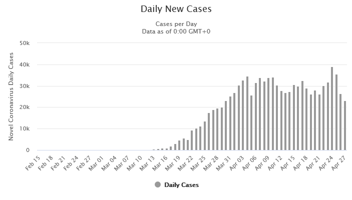 米国の新規感染者数は24日の3万8958人をピークに減少傾向にあり、27日は2万3196人と四割も減少しています。