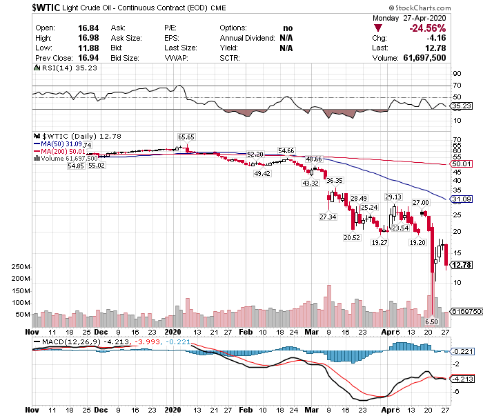 また、原油先物価格は前日比24.56%安の12.78ドル、現在はさらに11ドルを割り込むなど大暴落しています。これは、世界最大の原油ETFであるユナイテッドステーツ・オイルファンド(USO)が期近6月限のポジションを解消すると発表したためです。