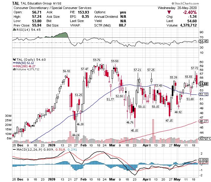 TALエデュケーションは年間売上高を3~4%水増ししていました。ただし、コロナウイルスの感染拡大を受けて、オンライン教育の需要が今後増えるとの見方から、株価は堅調に推移しています。