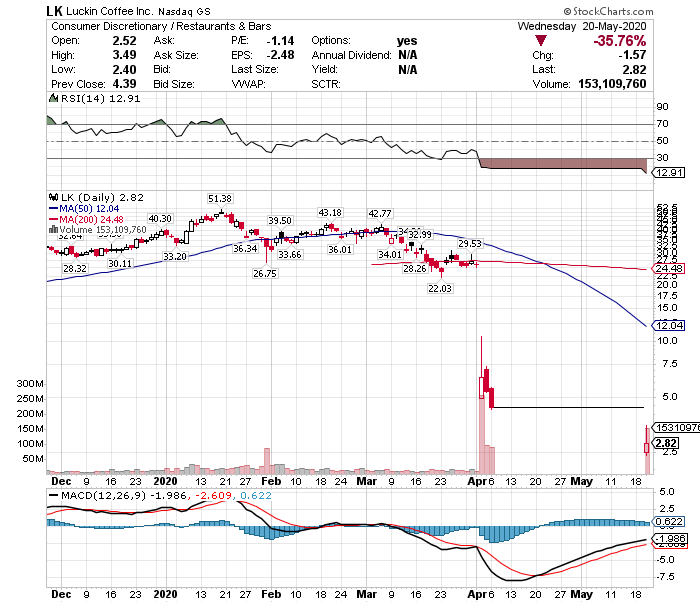 ラッキン・コーヒー株は4月7日以降売買停止になっていましたが、20日から再開されると同時に怒涛の勢いで売り浴びせられ、35.76%安の大暴落となりました。