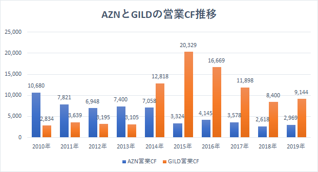【AZNとGILDの営業CF推移(単位:百万ドル)】