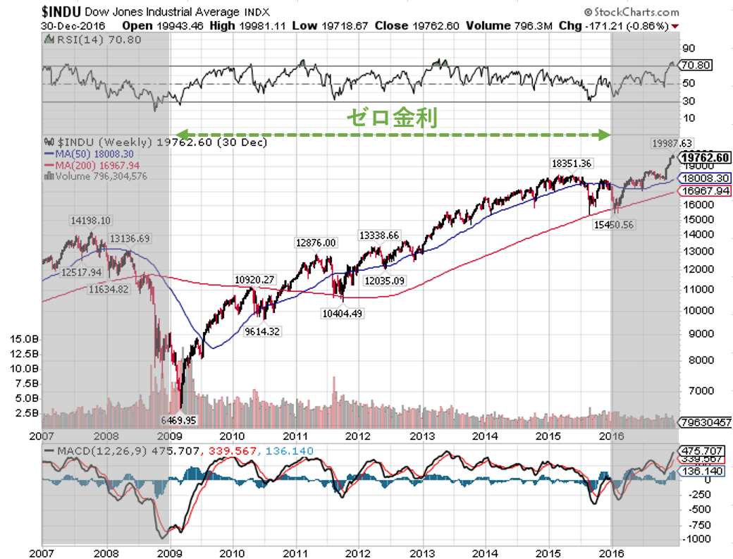 実際、FRBは2008年12月のFOMCで「ゼロ金利政策」を発表すると、株価はゼロ金利が続いた2015年12月まで大暴騰しました。ちなみに、ゼロ金利政策の解除に先駆けて2015年8月に株価が急落し始めているのは、当時、中国発の世界同時株安が米国株式市場にまで波及したためです。