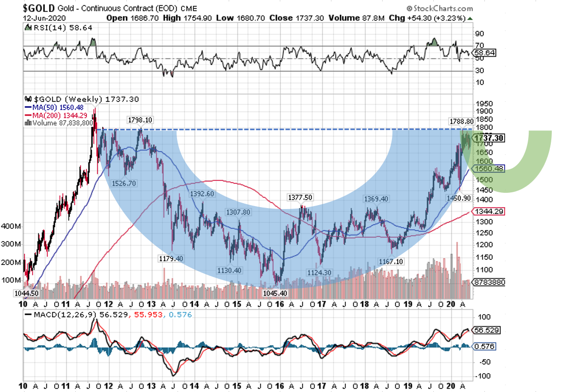 金の長期チャートを眺めると、「カップ・ウィズ・ハンドル」を形成しています。「カップ・ウィズ・ハンドル」とは、伝説の投資家ウィリアム・J・オニール氏が好んだチャートパターンで、チャートの形がちょうどティーカップのような形をしていることから、その名が付けられました。