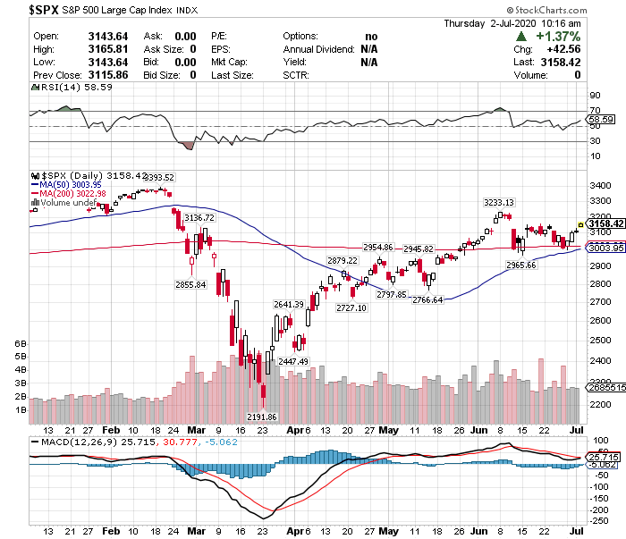 市場予想を上回る雇用統計を好感して、S&P500種指数は前日比1.37%高の3158.42と急伸しています。
