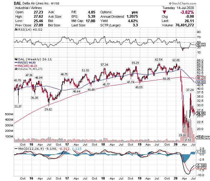 デルタ航空の株価はコロナショックによる暴落を受けた後反発していますが、これは一時的なもので、しばらく低迷する公算が大きいです。