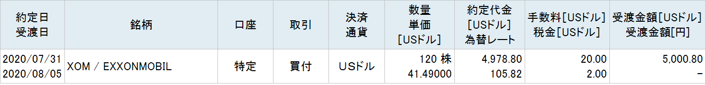 米石油メジャー最大手のエクソン・モービル(XOM)の株式を一株41.49ドルで120株、約5000ドル(約53万円)分買い増しました。