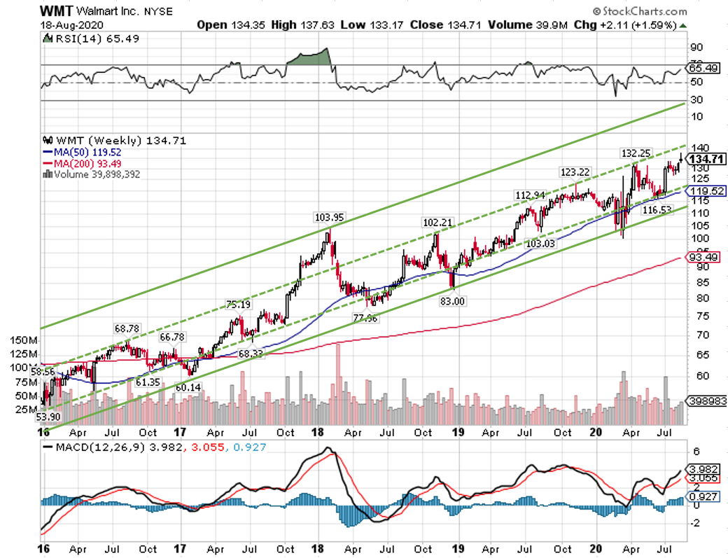 ウォルマートの週足チャートを眺めると、強気のトレンドチャネルを形成していることがわかります。短期的に見れば140ドル水準のレジスタンス(上値抵抗線)をターゲットに上昇し、それを上にブレイクアウトできるかどうかが試されます。