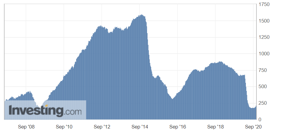 上のグラフはベーカーヒューズ社のリグ稼働数のことで、数字が増えているということは生産活動が拡大していることを意味し、その反対に数字が減っていれば生産活動が縮小していることを意味します。