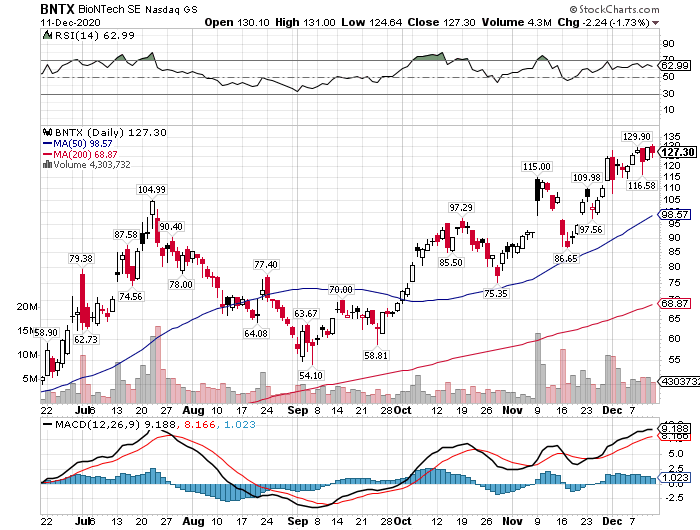 バイオンテックの株価は127ドルと過去最高値圏にありますが、今後は材料出尽くしの「売り」が広がる公算が大きいです。