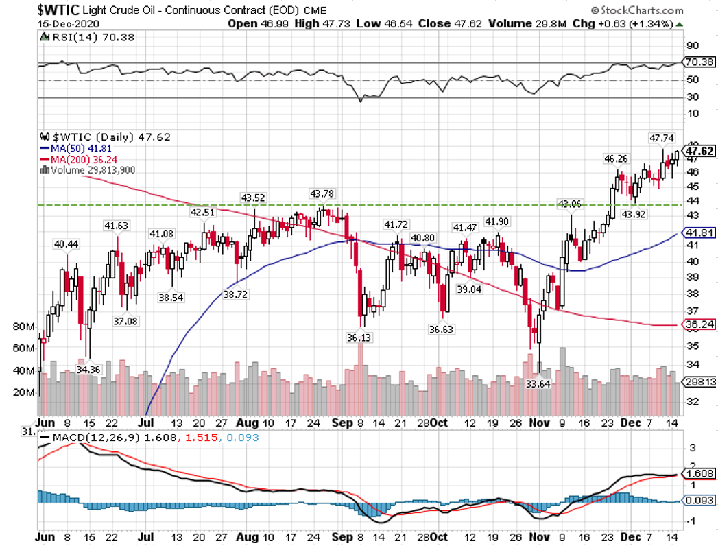 原油先物価格の日足チャートを眺めると、これまで44ドルをレジスタンス(上値抵抗線)に抑えられてきましたが、それを上にブレイクアウトしたことで一段と上昇するかどうかが注目されます。