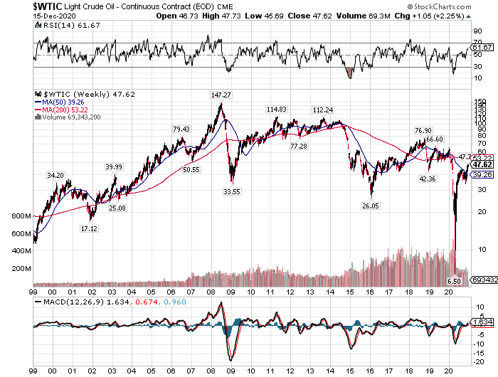 【原油先物価格(週足):1999-2020】