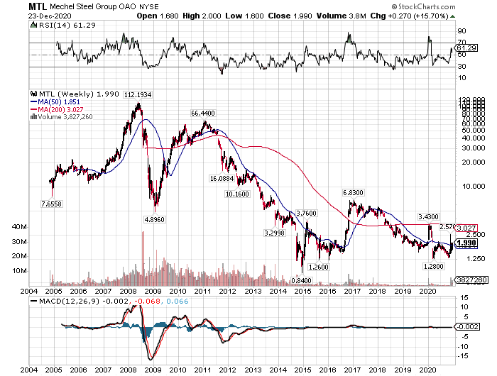 メチェルの長期チャートを眺めると、2008年のピーク112ドルから大暴落しています。そのため、メチェルのような小型炭鉱株への投資は幅広く分散されたポートフォリオにほんの少しだけ組み入れるくらいが丁度いいと思います。