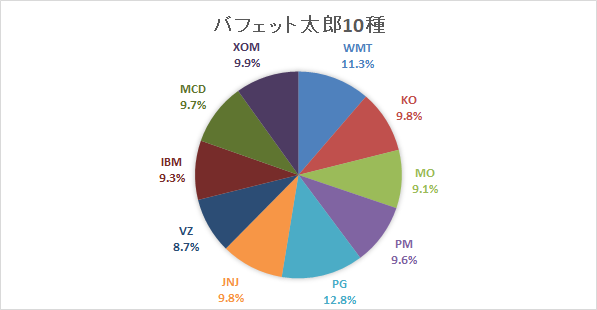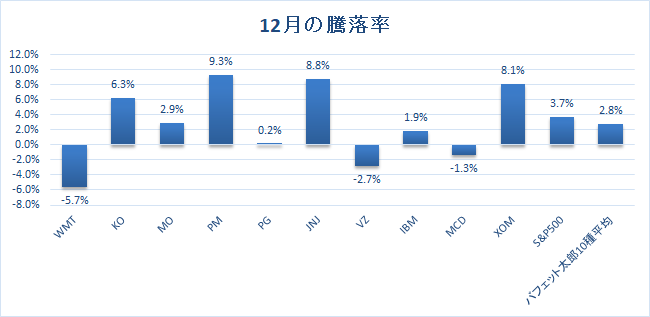 12月の騰落率はS&P500種指数が+3.7%だったのに対して、バフェット太郎10種は+2.8%と、市場平均を0.9%ポイント下回りました。フィリップ・モリス・インターナショナル(PM)やジョンソン・エンド・ジョンソン(JNJ)、エクソン・モービル(XOM)が大きく上昇したものの、ウォルマート(WMT)が5.7%安と沈んだことが平均を押し下げました。