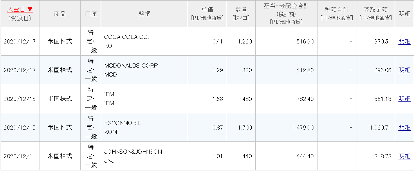 12月の配当金はコカ・コーラ(KO)、マクドナルド(MCD)、IBM(IBM)、エクソン・モービル(XOM)、ジョンソン・エンド・ジョンソン(JNJ)の5社から合計3635.20ドル(約37万5000円)、税引き後2607.14ドル(約26万9000円)の配当金を受け取りました。