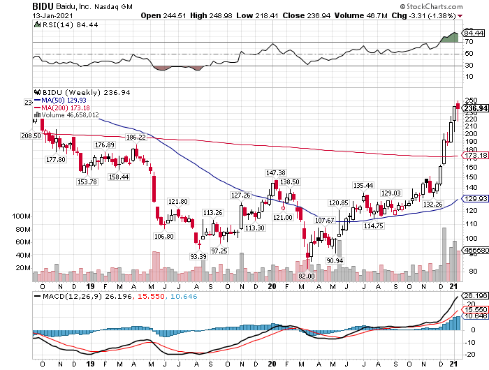 バイドゥは20年12月にスマホ向けアプリの改善で広告収入が大幅に伸びている他、2021年~23年の検索広告収入の年平均成長率は10%を超えるとの予想を示したことから株価が急騰しています。
