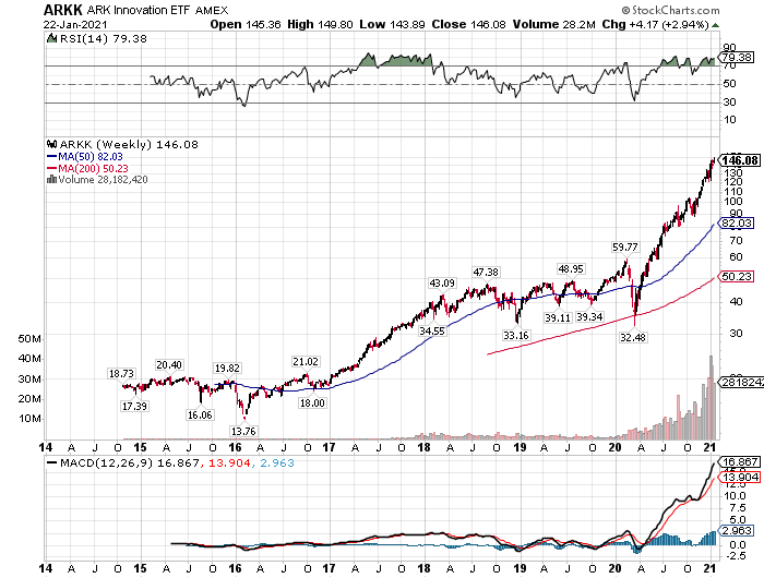 ちなみに、「アーク・イノベーションETF」は2014年に組成されたばかりの比較的新しいETFですが、テスラ株などハイパー・グロース株に集中投資することで驚異的なパフォーマンスを叩き出しています。