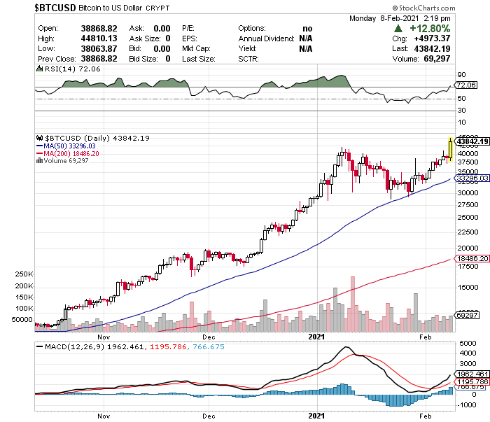 テスラのビットコイン購入の報道を受けてビットコイン価格は一時4万4810ドルと高騰しており、1月の調整局面を終えて史上最高値を更新しています。