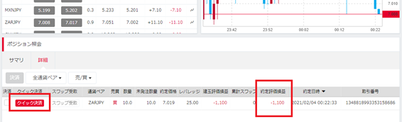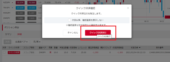 また「ポジション照会」の画面からは、そのまま決済もできます。下図の赤枠「クイック決済」がそれにあたります。