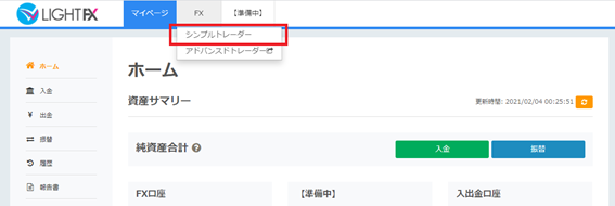 はじめてFXをする人や外貨投資を目的にFXをする人は、操作がしやすい「シンプルトレーダー」を選んだ方がいいと思います。ログイン後に表示されるグローバルメニュー内から取引システムを選択することができます。