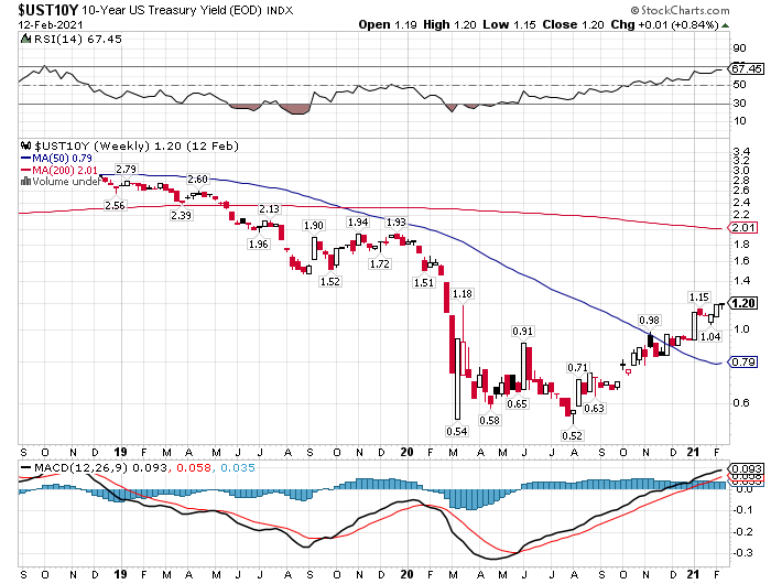 米10年債利回りの週足チャートを眺めると、2020年8月以降、下値を切り上げていることがわかると思います。これは、経済活動再開に伴う景気回復が期待されているためです。
