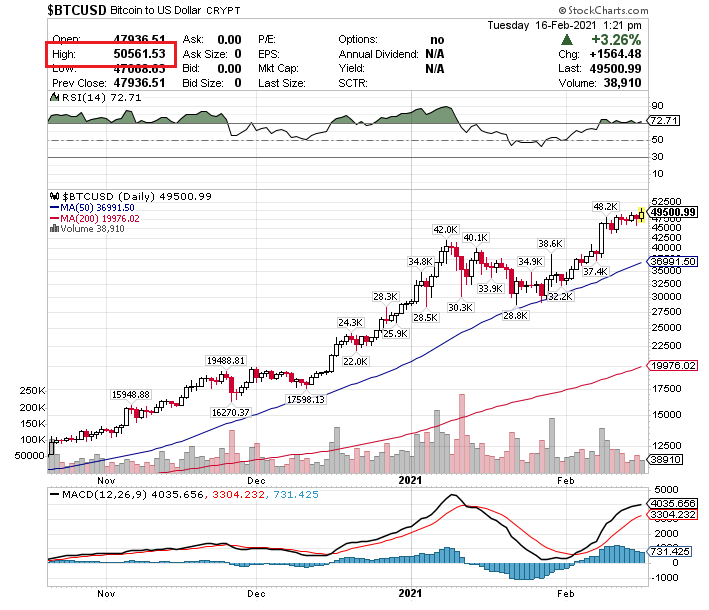 BTC価格が一時5万0561ドルと、5万ドルの大台を突破し史上最高値を更新しました。