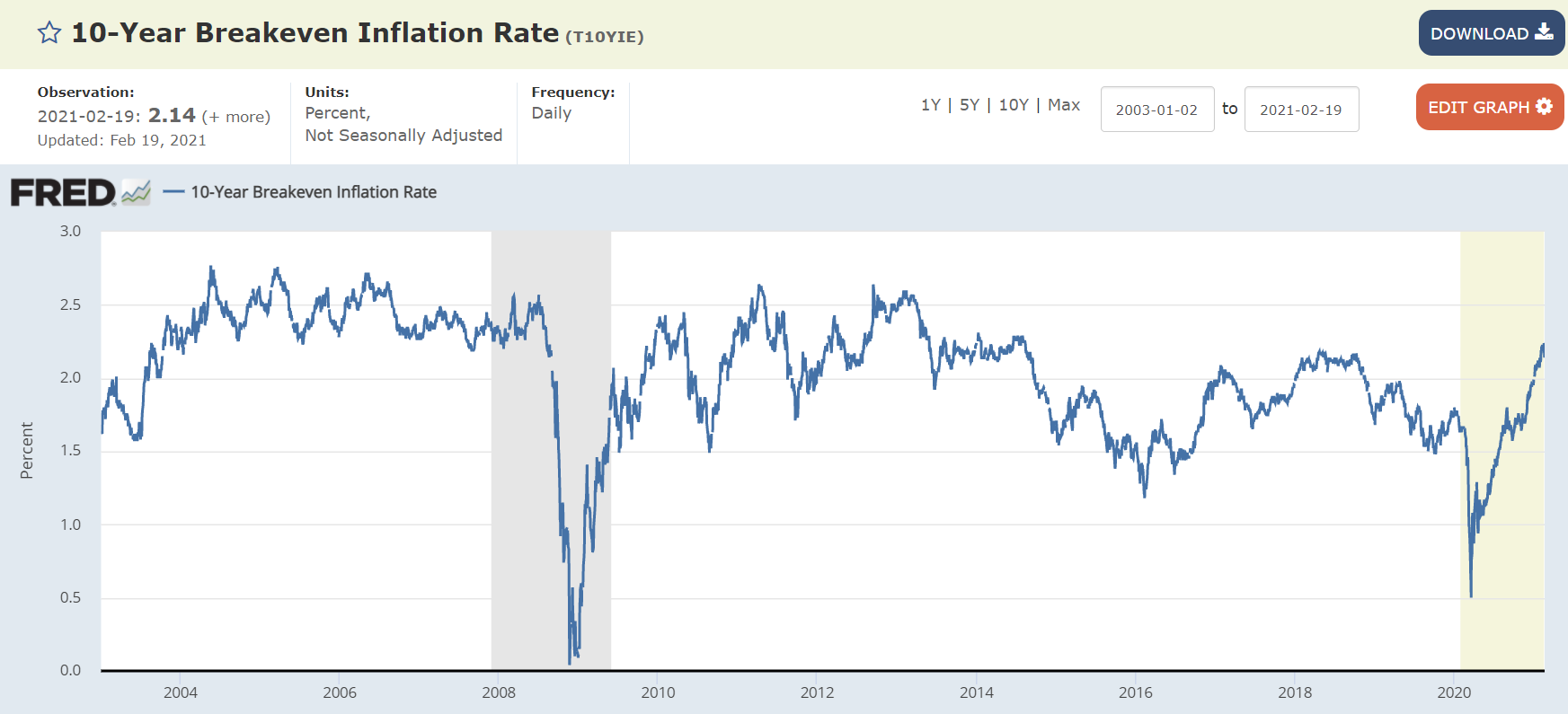 現在、10年物ブレーク・イーブン・レートは2.14%と2%の大台を突破しています。これは、投資家が向こう10年の年平均インフレ率が2.14%になると予想していることを意味しています。