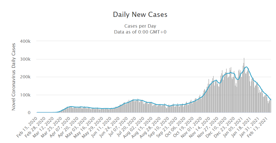 現在、新型コロナウイルスの新規感染者数は一日当たり5万~7万人と、1月のピークだった30万人から大幅に減少していますが、雇用が急速に回復するといった状態にはなっていません。