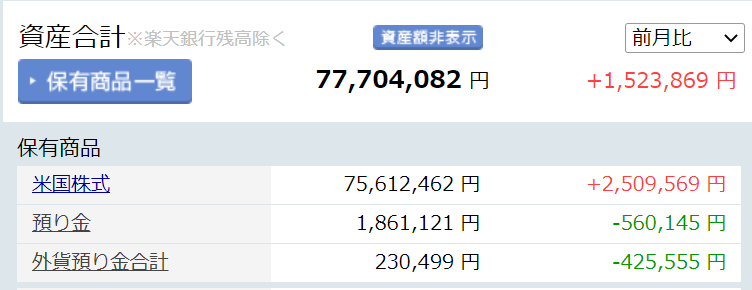 内訳は米国株7560万円、現金210万円で、現金比率は2.7%となっています。