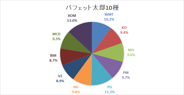 バフェット太郎10種における組み入れ比率上位銘柄は、エクソン・モービル(XOM)が13.0%、プロクター&ギャンブル(PG)11.3%、ウォルマート(WMT)10.2%となっています。