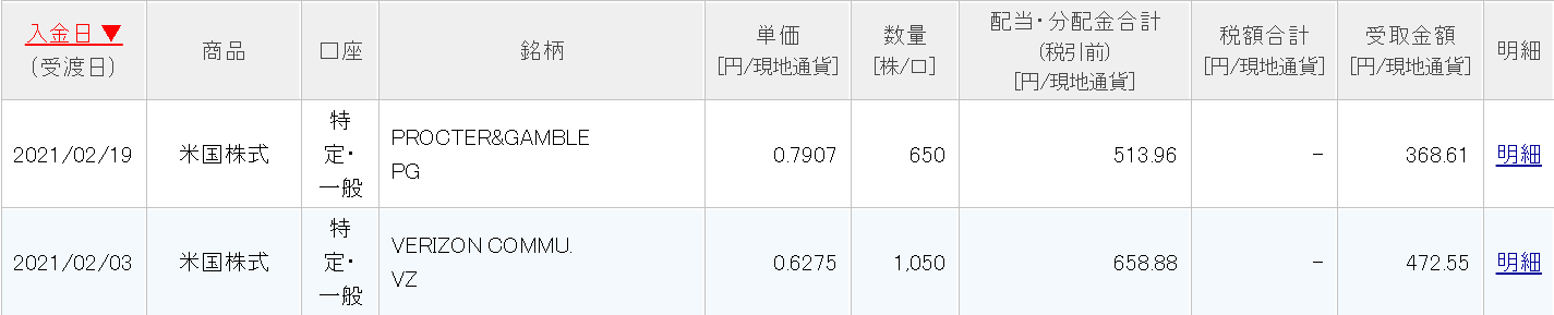 2月はプロクター&ギャンブル(PG)とベライゾン・コミュニケーションズ(VZ)の2社から合計1172.84ドル(約12万5000円)、税引き後841.16ドル(約9万円)の配当金を受け取りました。