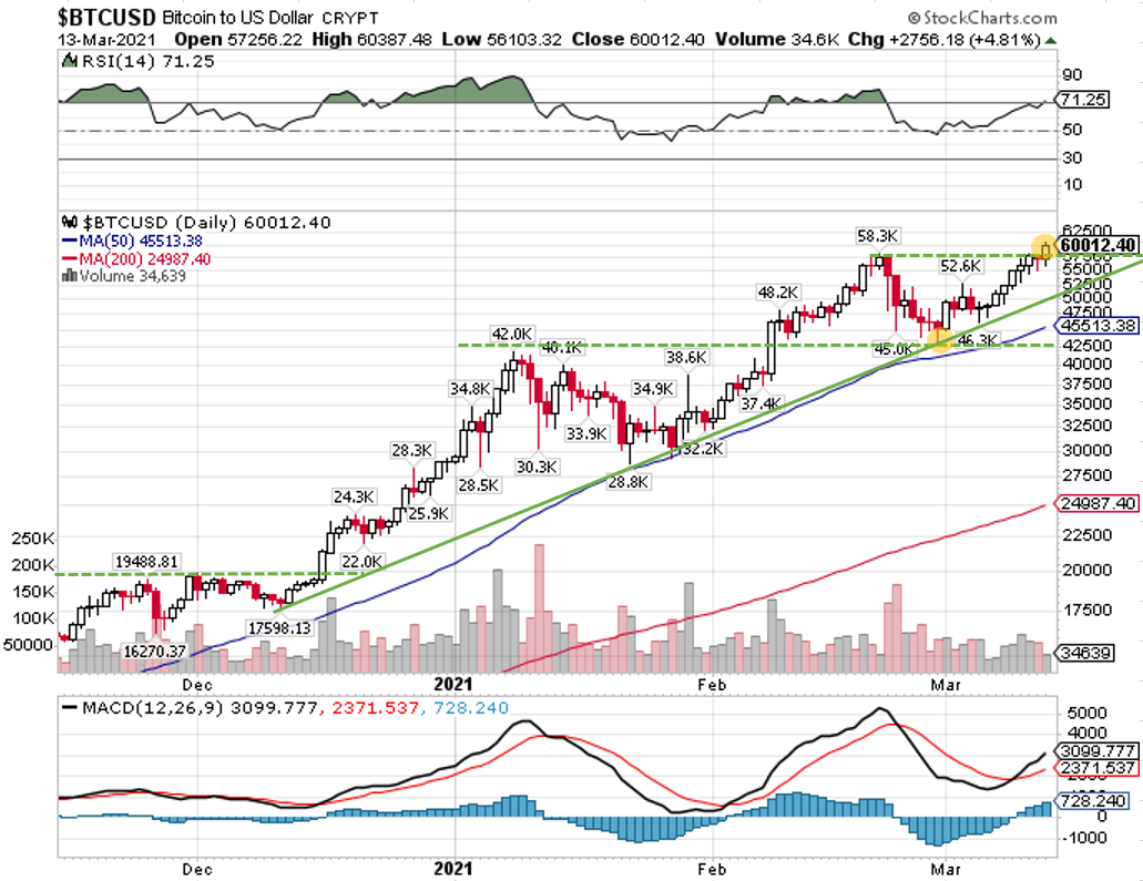 その後、2月の史上最高値5万8300ドル水準のレジスタンスを上にブレイクアウトすることができるのかが注目されていましたが、13日に無事上にブレイクアウトすることができました。