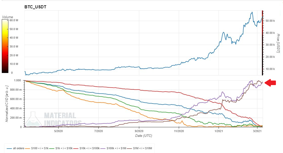 BTC価格が2万ドルを突破して以降、紫色と茶色のチャートだけ上昇していることがわかると思いますが、紫色が10万~100万ドルの出来高で茶色が100万~1000万ドルの出来高になります。