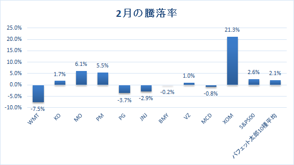 2月の騰落率はS&P500種指数が+2.6%だったのに対して、バフェット太郎10種の平均は2.1%でした。これはエクソン・モービル(XOM)が+21.3%だった一方、ウォルマート(WMT)をはじめ5銘柄がマイナスリターンだったためです。