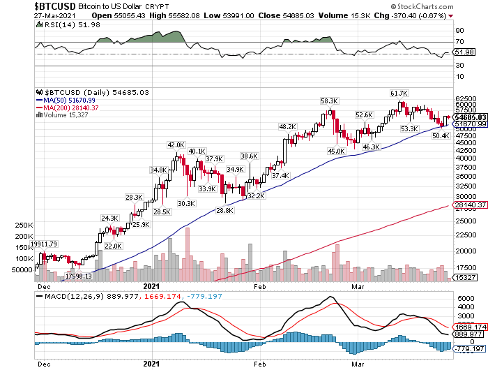 ビットコインの日足チャートを眺めると、一時5万0400ドルと、史上最高値の6万1700ドルから18.3%安と急落する場面がありました。