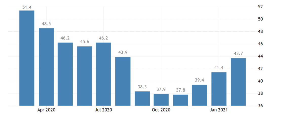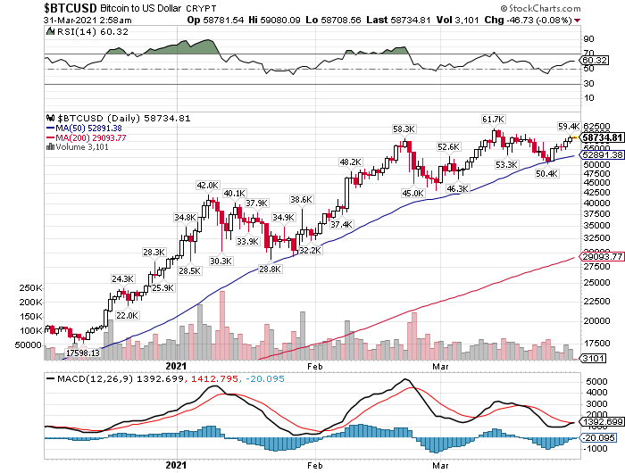 さて、ビットコインの日足チャートを眺めると、50日移動平均線をサポートラインに反発しており、史上最高値の6万1700ドルをターゲットに上昇を開始していることがわかります。