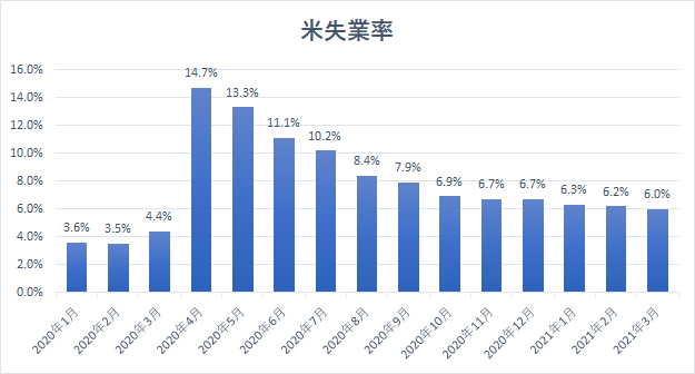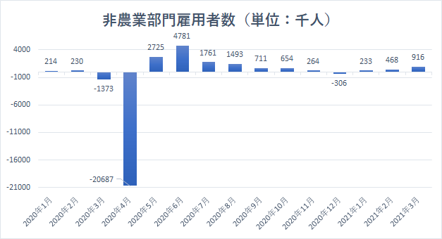 これで、2020年5月から2021年3月までの11カ月間で、1370万人分の雇用を取り戻しましたが、2020年の3月と4月のわずか2カ月間で2206万人もの労働者が職を失ったことを考えると、米労働市場の回復は未だ道半ばだと言えます。