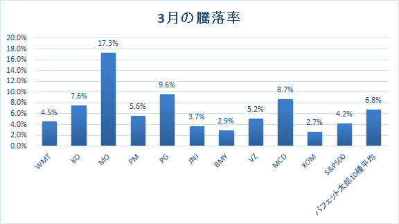 3月の騰落率はバフェット太郎10種平均が+6.8%と、S&P500種指数の+4.2%を2.6%ポイントアウトパフォームしました。これは、米タバコ最大手のアルトリア・グループ(MO)の株価が+17.3%と急騰したことが寄与しました。