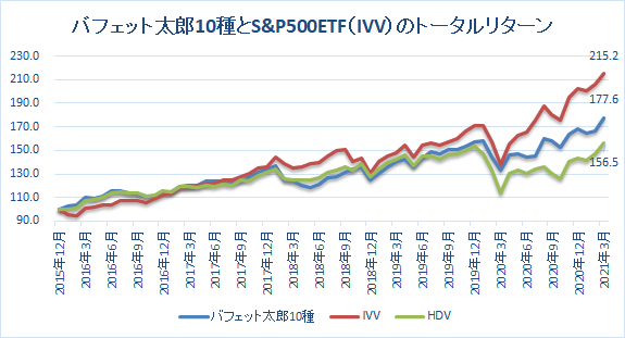 2015年12月末から2021年3月末までのバフェット太郎10種とS&P500ETF(IVV)、そして米高配当株ETF(HDV)のトータルリターンは以下の通りでした。