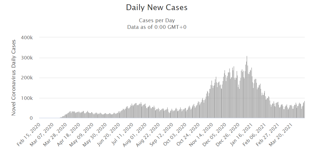 たとえば、米国の1日あたりの新規感染者数は8万5000人と、緩やかな上昇基調にあり第4波が懸念されています。