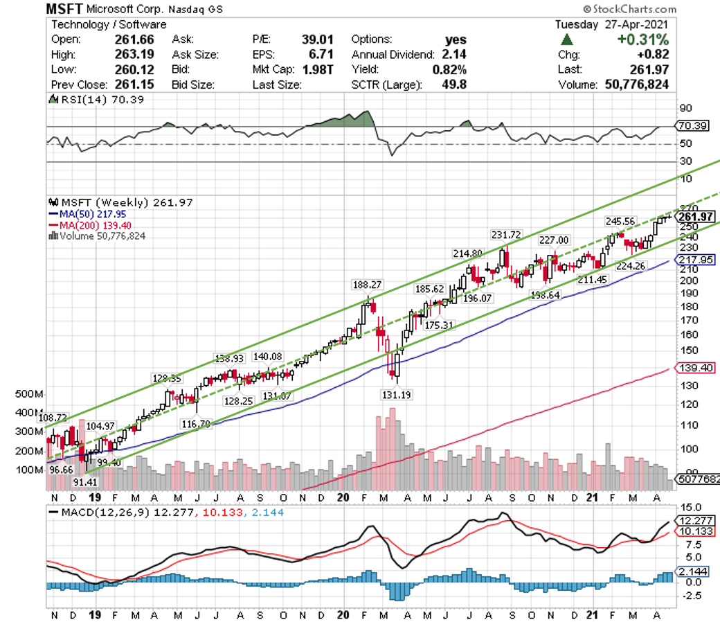 マイクロソフトの週足チャートを眺めると、強気のトレンドチャネルを形成していることが確認できますから、これからも強気相場が続く公算が大きいです。