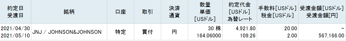 トータルヘルスケア大手のジョンソン&ジョンソン(JNJ)の株式を164.06ドルで30株、約4900ドル(約57万円)分買い増しました。