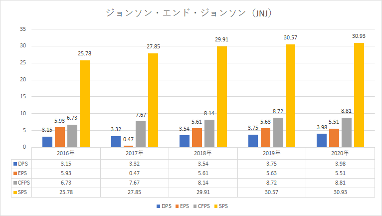 ジョンソン&ジョンソンの過去5年の業績推移を眺めると、CFPS(一株当たりの営業キャッシュフロー)が安定しているほか、緩やかに成長していることがわかると思います。